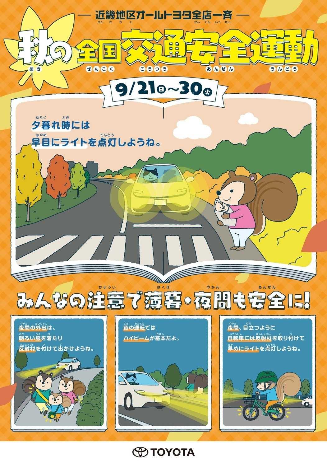ドライバーは早めのライト点灯、歩行者は反射材の着用を心がけましょう🔦