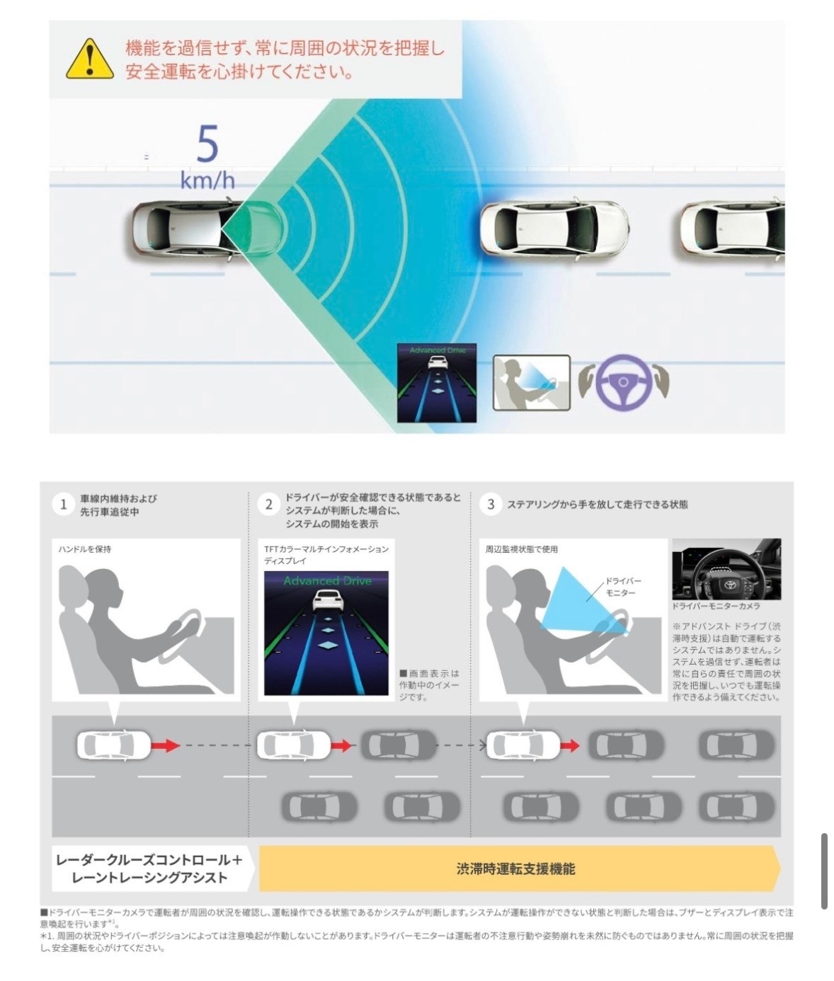 高速道路・自動車専用道路での運転において渋滞時にレーダークルーズコントロールおよび