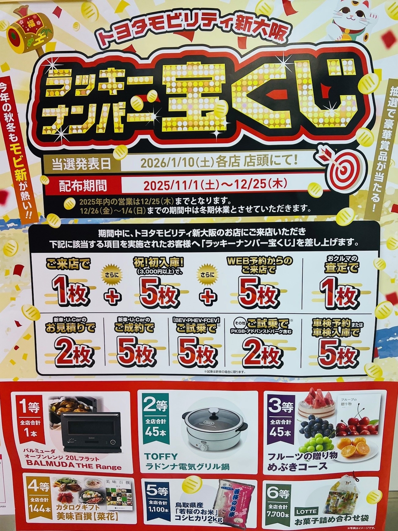 期間中にトヨタモビリティ新大阪にご来店頂いたお客様に”ラッキーナンバー宝くじ”を