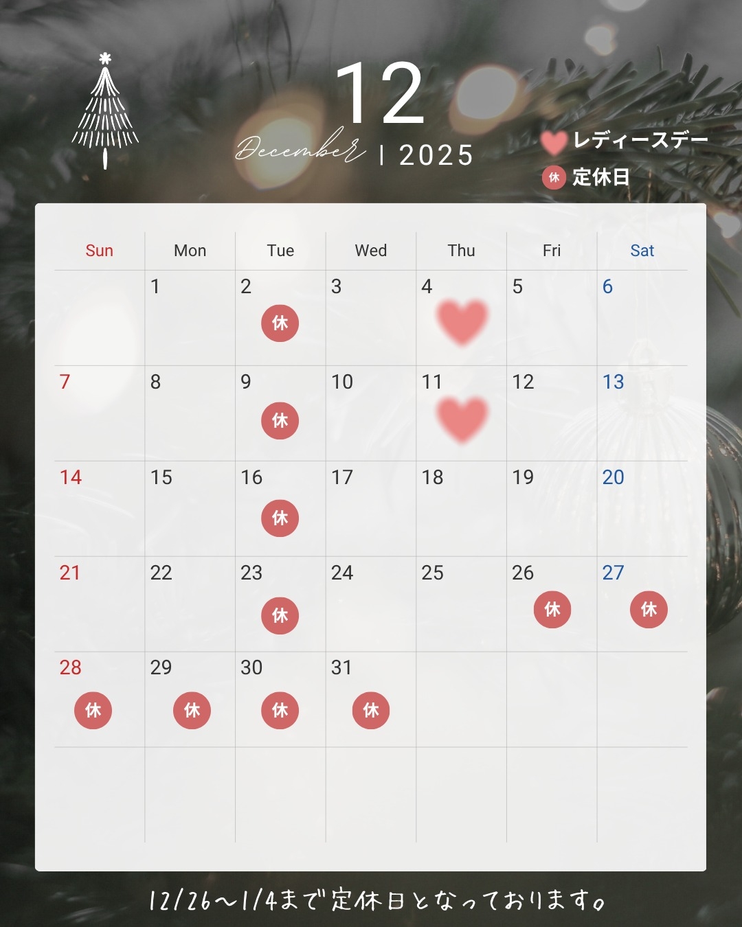 12/26から1/4まで、長期休みとなっております💁🏻‍♀️