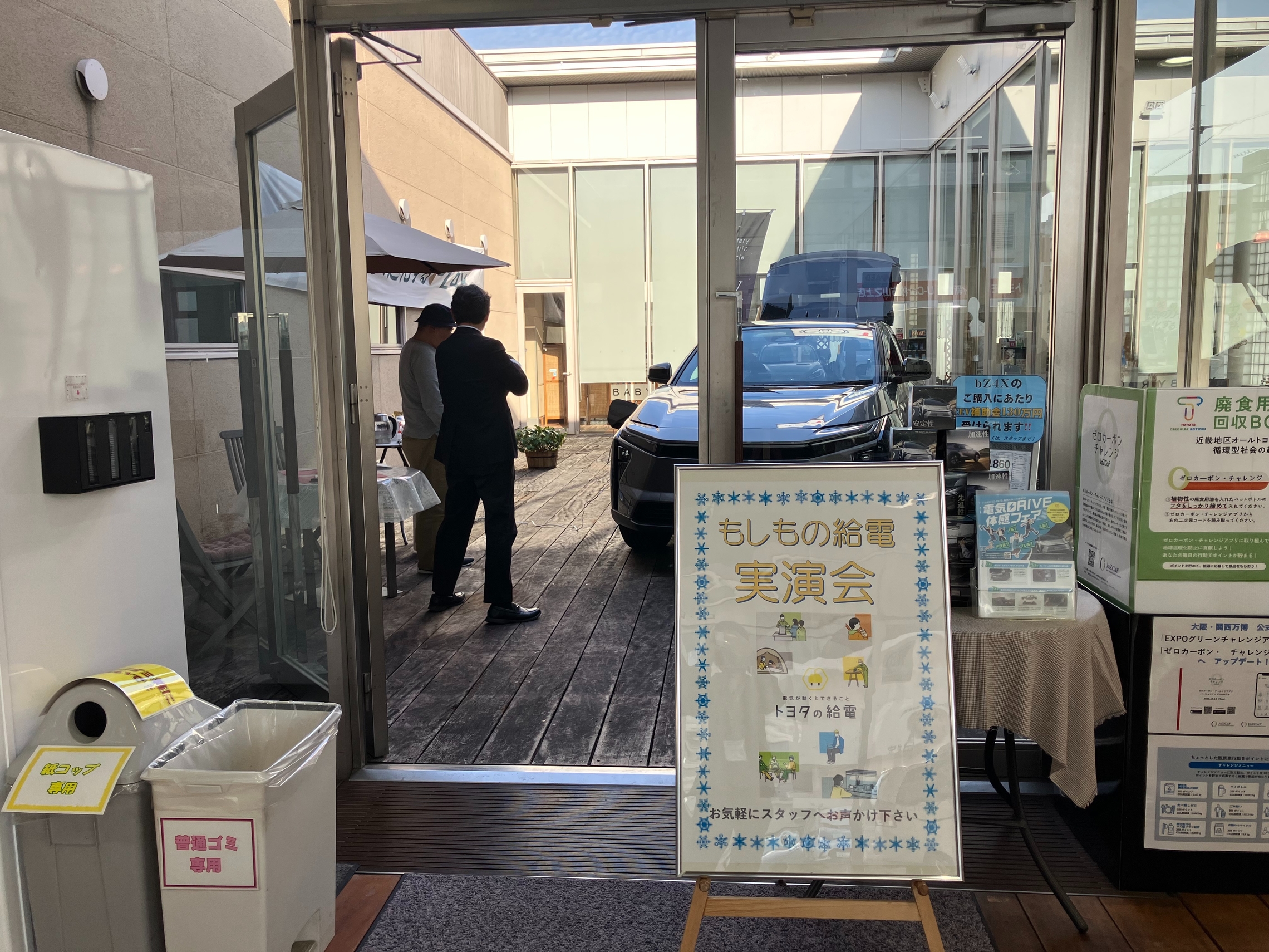 中庭に展示している車(bZ4X)の非常時給電システムの電気を使い、