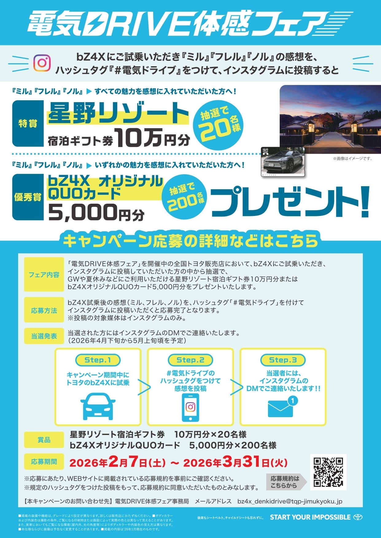 期間中にbZ4Xをご試乗いただき、『ミル』『フレル』『ノル』の感想を#電気ドライブをつけてインスタグラムに投稿いただくと、抽選でプレゼント!