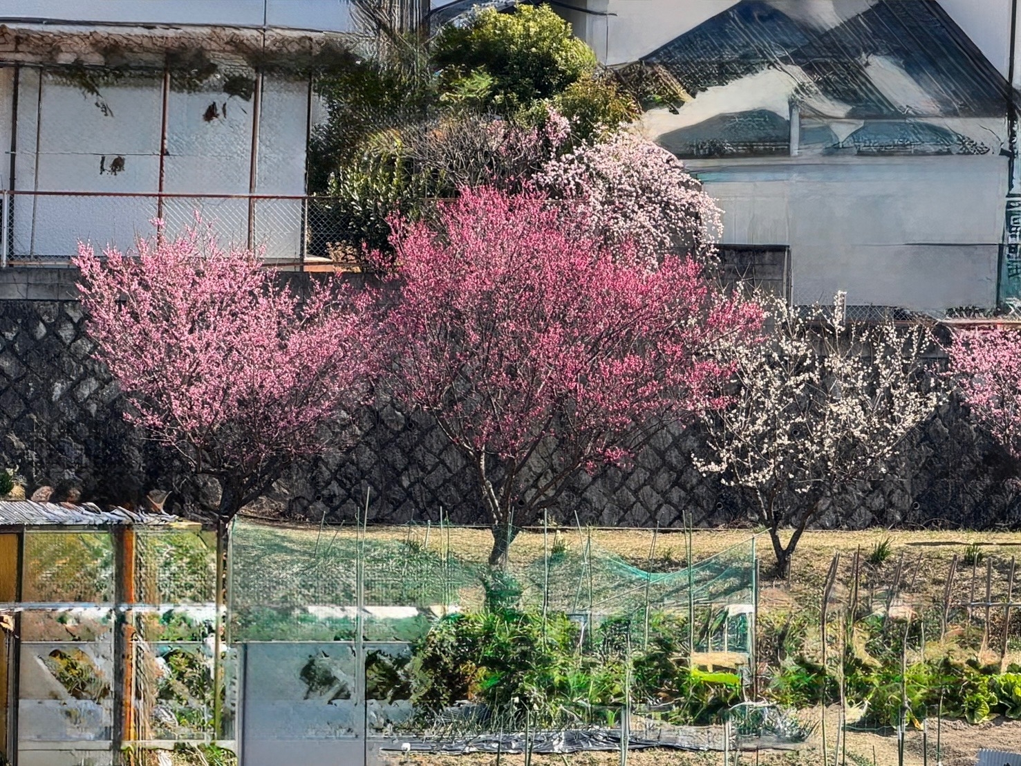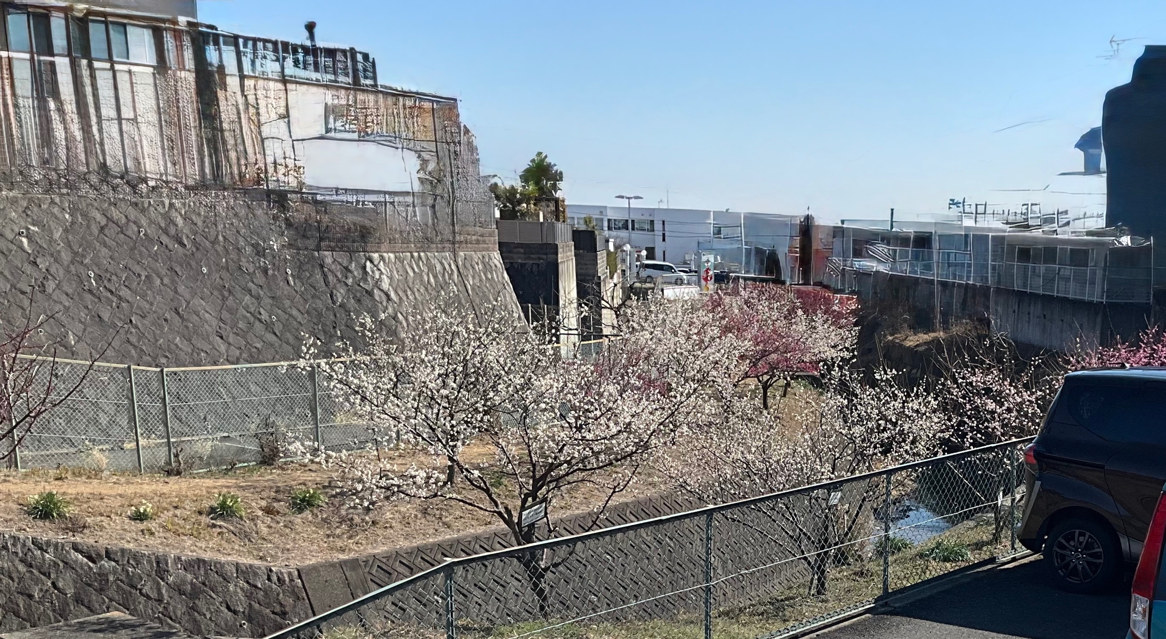 店舗の裏手を流れる箕川沿いには、白やピンクの梅が長い道のりに美しく咲き揃い、