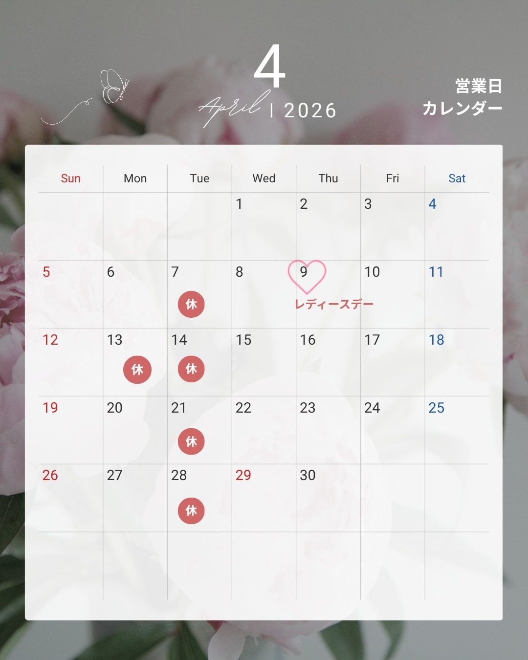 さて4月より、定休日が一部変更となりましたのでお知らせさせて頂きます。